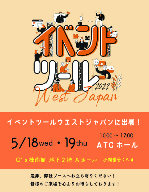 弊社は5月18日(水)・19日(木)大阪 ATCホールにて開催されます。イベントツールウエストジャパン2022に出展いたします!新商材を多数導入した弊社ブースへ是非お立ち寄りくださいませ。